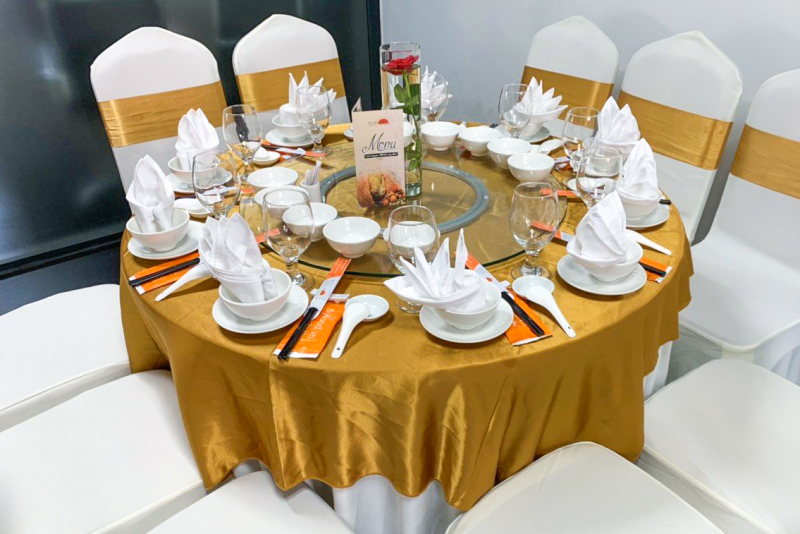 - 01 Bộ bàn tròn, 10 ghế tựa lưng, bao phủ, cột nơ, khăn trải bàn 2 lớp, mặt kính xoay.